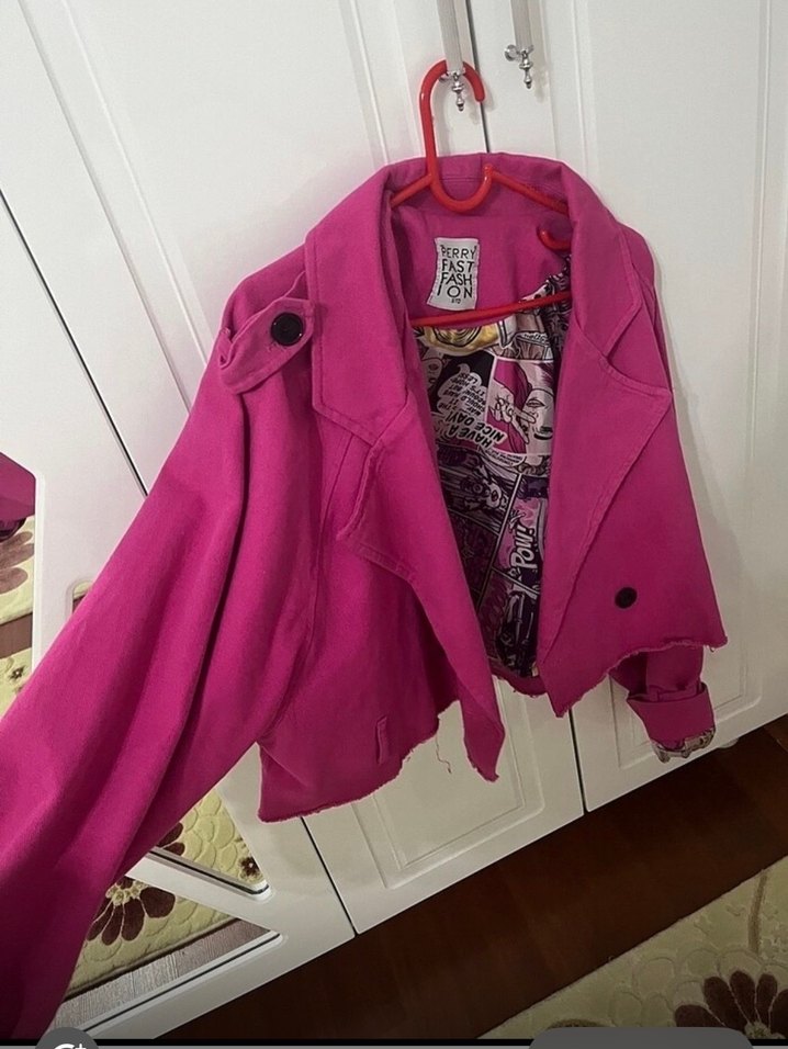 Renkli baskılı astarlı, düğmeli, uzun kollu, normal boy midi pembe hamile ceketi, salaş kesim, günlük sokak stili için uygun. Çok az giyildi
