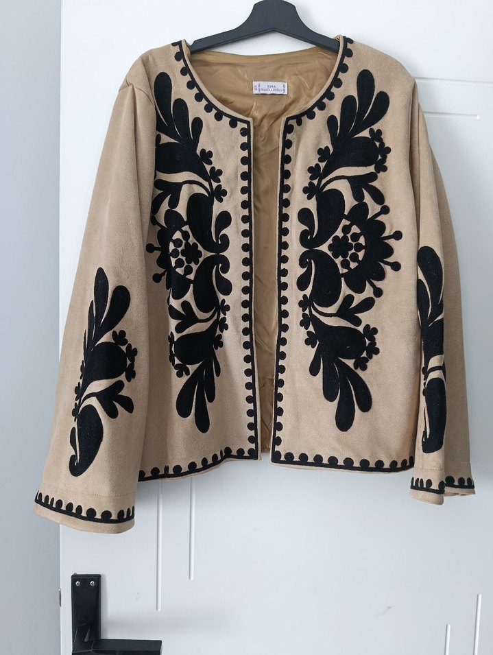 Bej renkli süet ceket, siyah nakışlı çiçek desenleri, yakalı ve düğmeli. Uzun kollu, bol kesim bohem tarzı ceket. hiç kullanılmadı