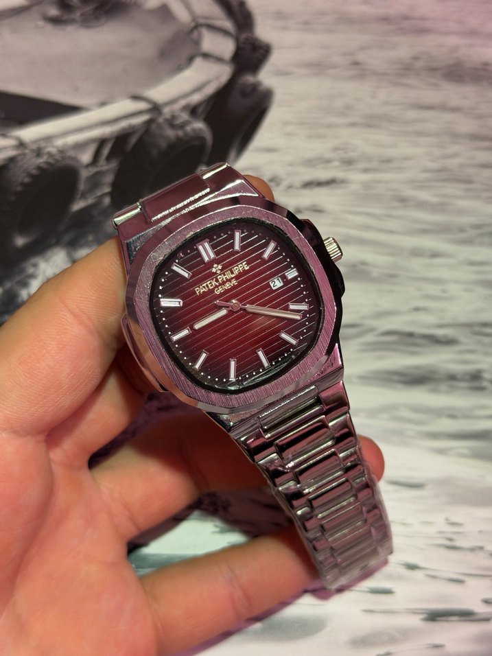 Koyu bordo kadran ve uyumlu metal bilezikli erkek saati, klasik tasarımı streetwear tarzıyla birleştiriyor. Tarih göstergesi ve dokulu kadran bulunur. ⌚