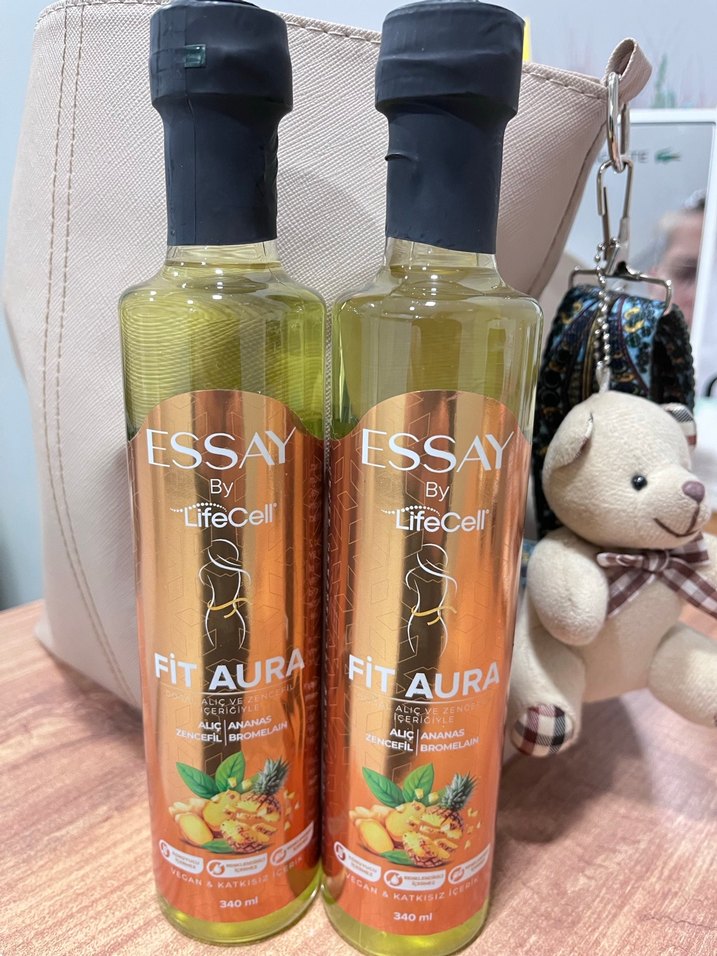 Essay By LifeCell Fit Aura içecek, ananas ve zencefil gibi doğal özler içerir. Her şişe 340 ml hacmindedir.