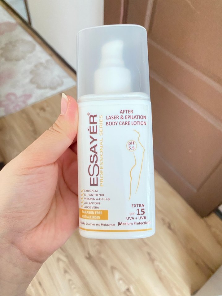 Essayer lazer ve epilasyon sonrası vücut losyonu SPF 15 ile orta düzey UVA+UVB koruması sağlar. Vitamin A, E, panthenol ve aloe vera ile cildi yatıştırır ve nemlendirir.