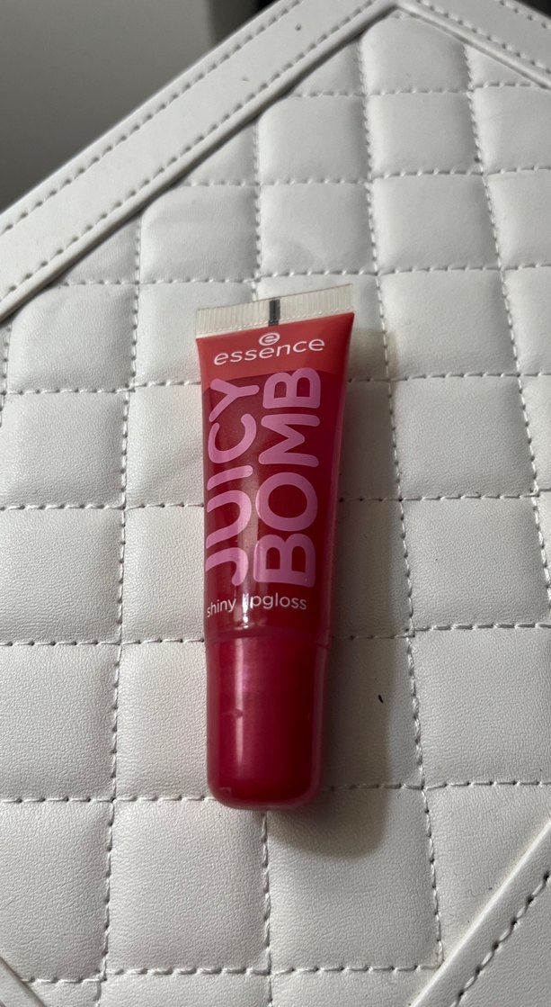 Essence Juicy Bomb parlak pembe dudak parlatıcısı, renkli ve parlak bir görünüm sağlar. Üzerinde 'Hpgloss' yazısı bulunur. yarısından biraz fazla dolu