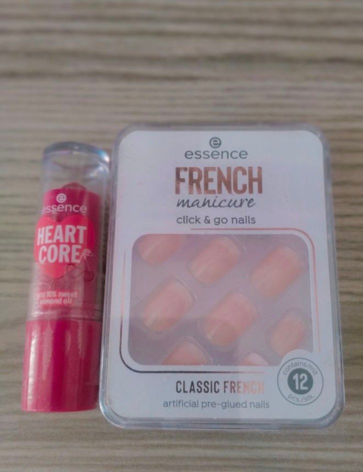 Essence Heart Core dudak balmı ve pastel pembe renkte klasik Fransız yapay takma tırnaklar.Tırnaklar kolay uygulanabilen click & go tasarıma sahiptir.