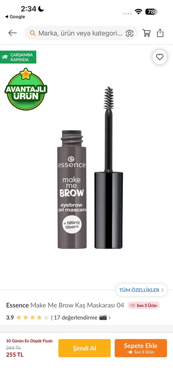 Essence Make Me Brow kaş maskarası, gri renkte, kaşlara dolgunluk ve doğal bir görünüm kazandıran fiber içerir. ️