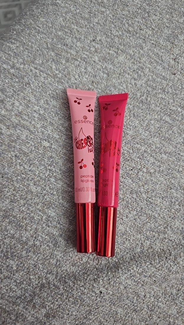 Essence markasına ait, kiraz desenli, pastel pembe tonlarda 10 ml'lik dudak parlatıcısı seti. Parlak bitiş sağlar.