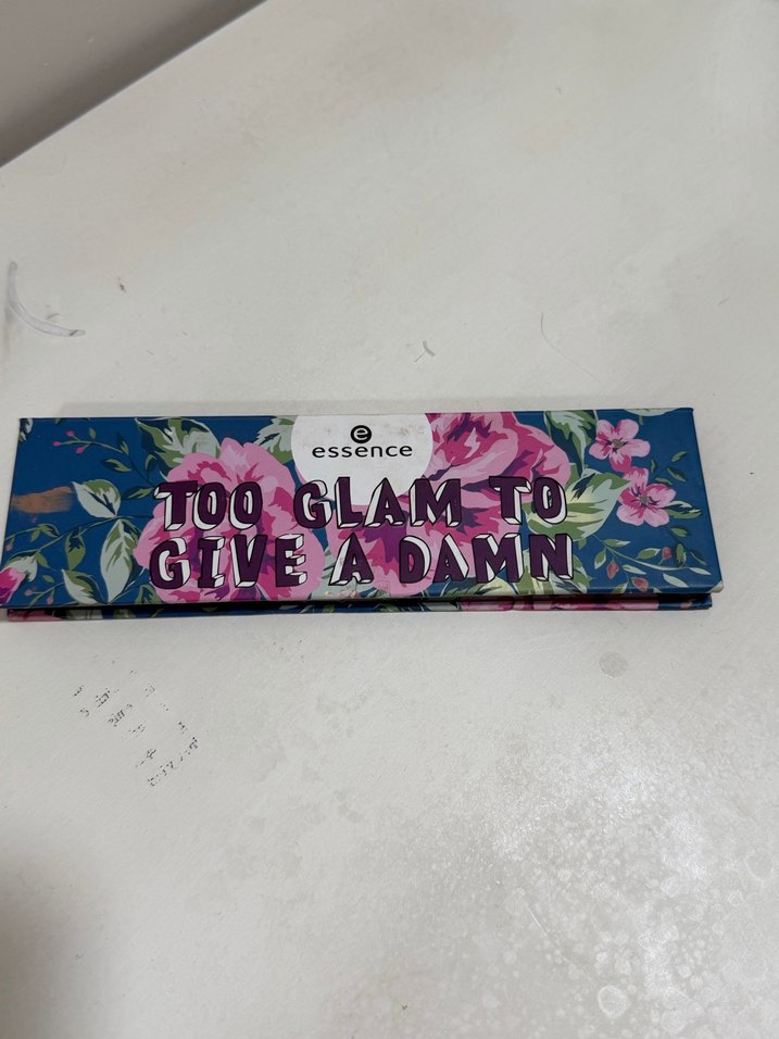 Essence markasına ait, parlak pembe renkte ve çiçek desenli ambalajda 'Too Glam To Give A Damn' makyaj paleti