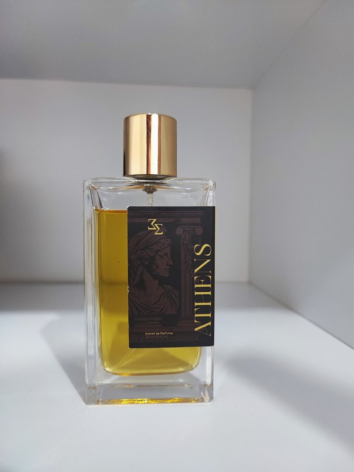 Modern klasik tarzda, parlak altın kapaklı ve şeffaf dikdörtgen şişede klasik bir erkek parfümü. Şişe içinde altın renk sıvı ve 'ATHENS' etiketi bulunur. ✨
