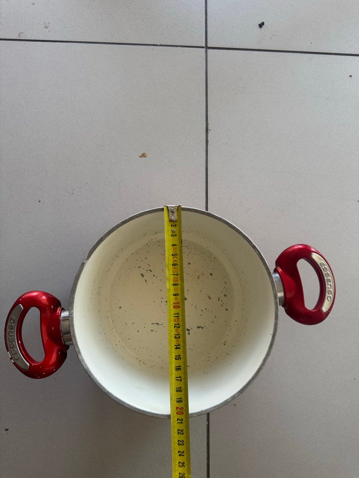 Beyaz tencere, renkli kırmızı saplara sahip, geniş ağızlı ve çeşitli yemekler için uygun. İç kısmında kullanıma bağlı izler bulunur.