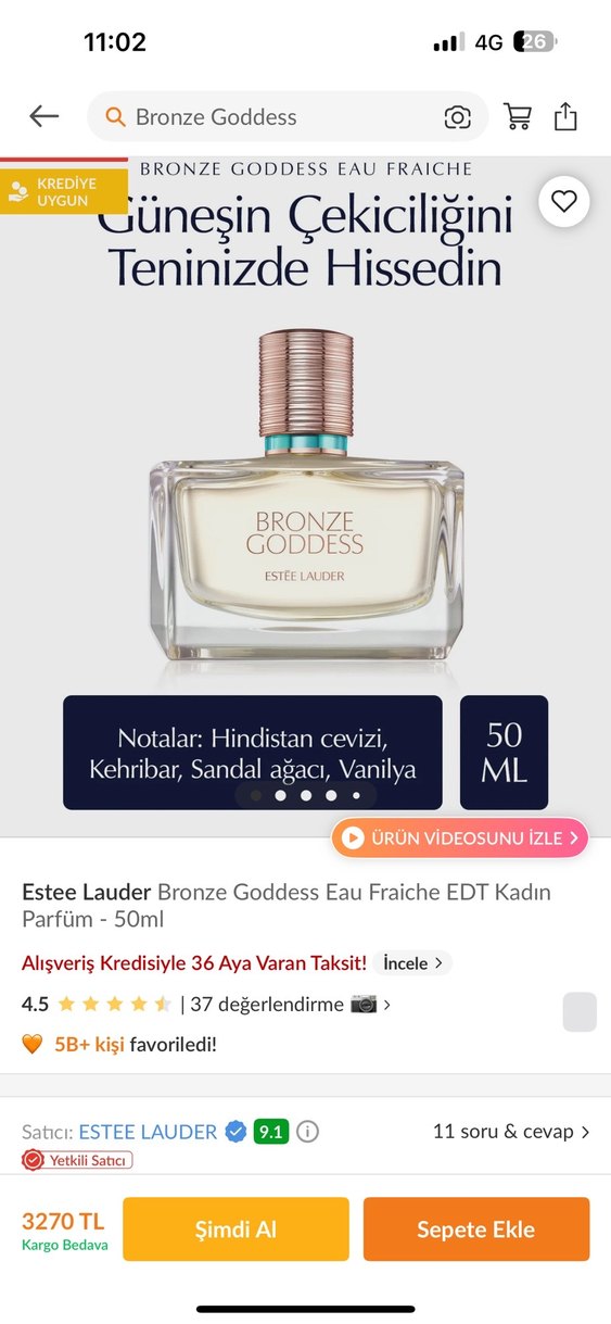 Estee Lauder Bronze Goddess Eau Fraiche 50ml kadın parfümü, hindistan cevizi, kehribar, sandal ağacı ve vanilya notalarıyla sıcak ve çekici bir koku sunar.