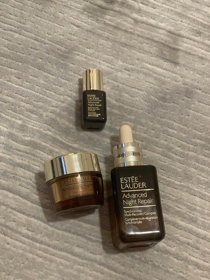 Estee Lauder Gelişmiş Gece Onarıcı serumu ve kremi, yaşlanma karşıtı ve cilt onarımı için. Çoklu iyileştirici kompleks içerir.