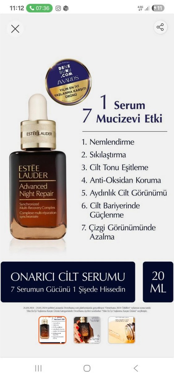 Estee Lauder Advanced Night Repair serumu, 7 etkili bakım sunar: nemlendirme, sıkılaştırma, cilt tonu eşitleme, antioksidan koruma, aydınlık cilt görünümü, cilt bariyerinde güçlenme ve çizgi görünümünde azalma. 20 ml.