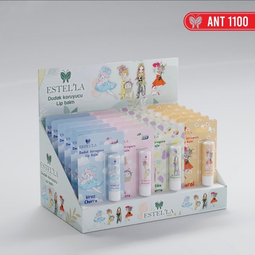 Estel'la dudak koruyucu seti, kiraz ve çiçek desenli çok renkli pastel tonlarda dudak bakımı sağlar.