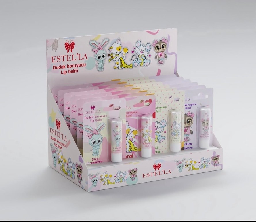 Estel'la pembe pastel renkli, çilek aromalı dudak koruyucu lip balm. Ambalajında sevimli hayvan figürleri bulunur. Çocuk balm