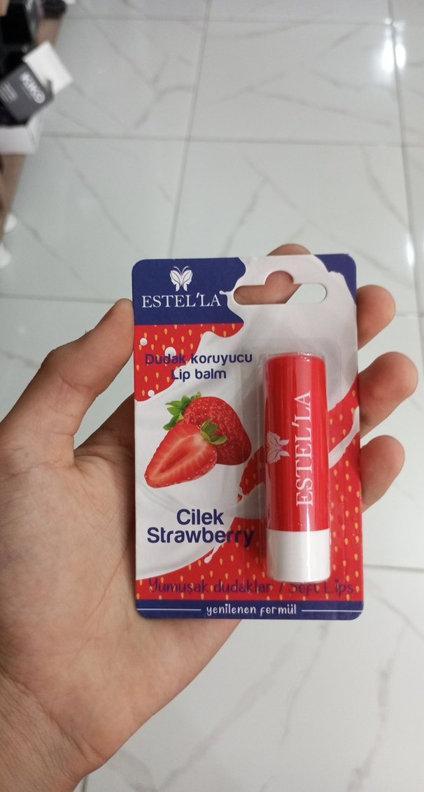 Estella çilek aromalı dudak koruyucu, yenilenen formülüyle dudakları yumuşak tutar.