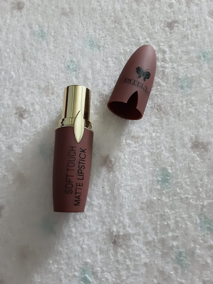 Estella mat ruj, gül kurusu renkte yumuşak dokunuşlu bir görünüm sunar. Altın detaylı ambalajı ve çıkarılabilir kapağı vardır. elimin üzerinde rengine baktım sadece hiç kullanılmadı