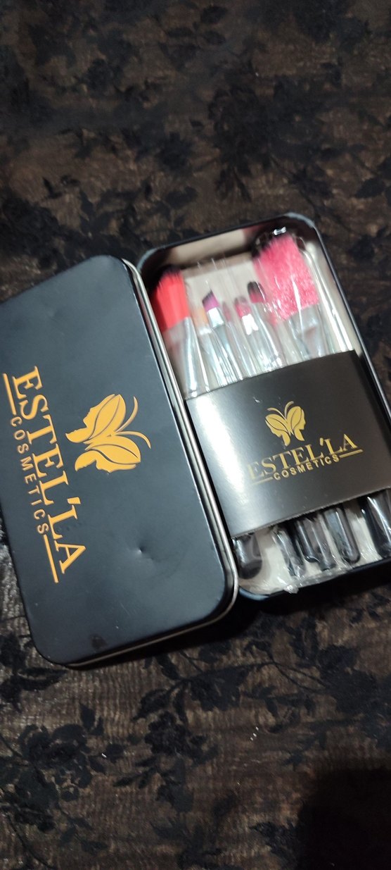 Estella Cosmetics siyah saplı, çeşitli fırçalardan oluşan makyaj fırça seti. Kompakt metal kutuda sunulur. ️7 lı set