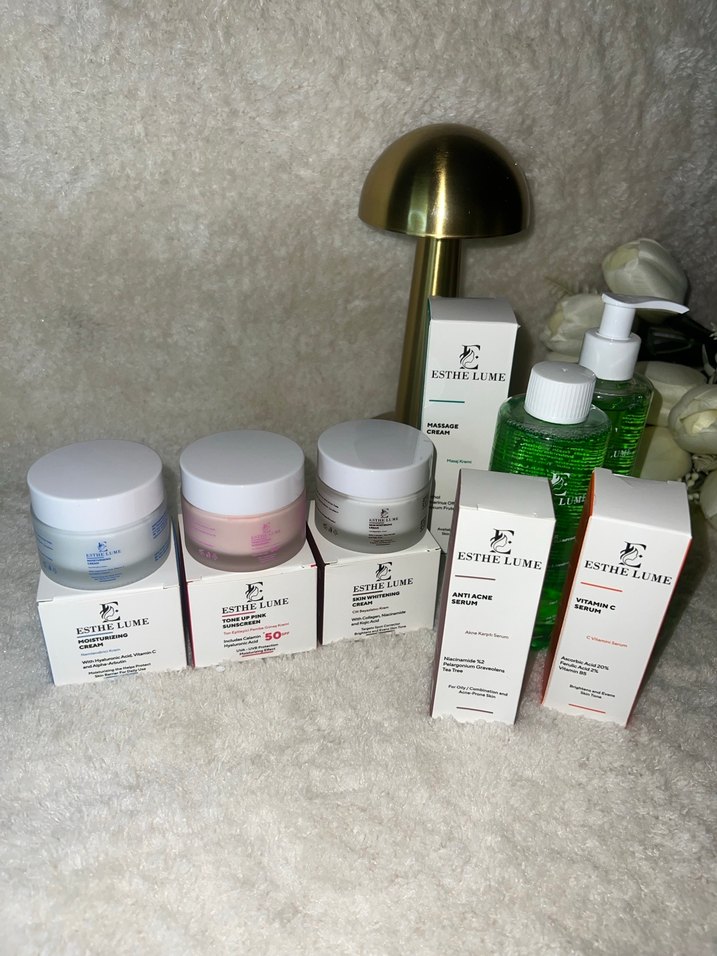 Esthe Lume cilt bakım seti, nemlendirme ve koruma amaçlı krem ve serumlar içerir. Ürünler kavanoz ve şişelerde, sade tasarımlıdır.