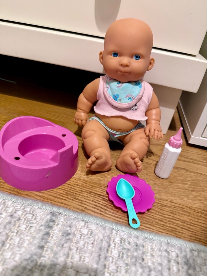 Mavi gözlü pembe bebek oyuncak, biberon, kaşık, tabak ve lazımlık aksesuarlarıyla birlikte gelir.