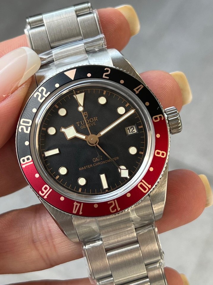 • Model: Tudor Black Bay GMT • Çap: 41 mm • Mekanizma: Otomatik (in-house MT5652, GMT fonksiyonlu) • Bezel: Kırmızı-siyah “Pepsi” 24 saatlik GMT bezel • Cam: Safir • Bilezik: Çelik bilezik • Takvim: 3 yönünde tarih • Su geçirmezlik: 200 m