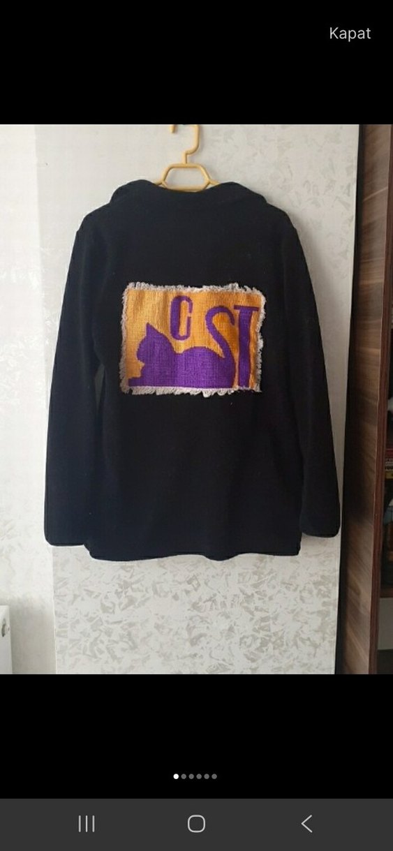 Yurtdisinda geri donusum temali bir sergiden aldim. Hic giyilmedi. Sol kosede bir armayi kapatmak icin isleme yapilmis. Arkasinda etamin tablo kedi islemesi var. Dolabimda yun kazaklarin yaninda durdugundan ustune tuy gelmis temizlenip gonderilecektir. siyah gotik tarzda kedi kıyafeti. Üzerinde mor kedi silueti baskılı yama bulunur. Yumuşak ve rahat kumaş içerir.