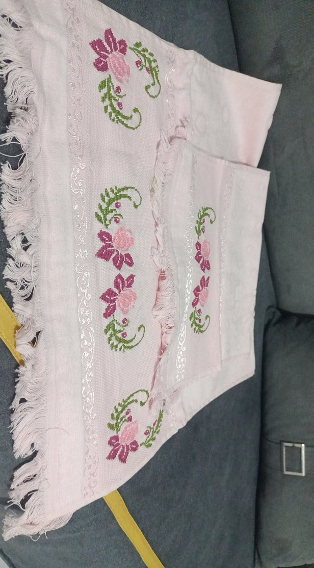 Yumuşak kumaştan, püsküllü kenarları ve nakışlı çiçek desenleri olan beyaz havlu.