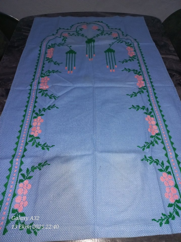 Etamin İşlemeli Mavi Çiçek Desenli Seccade
