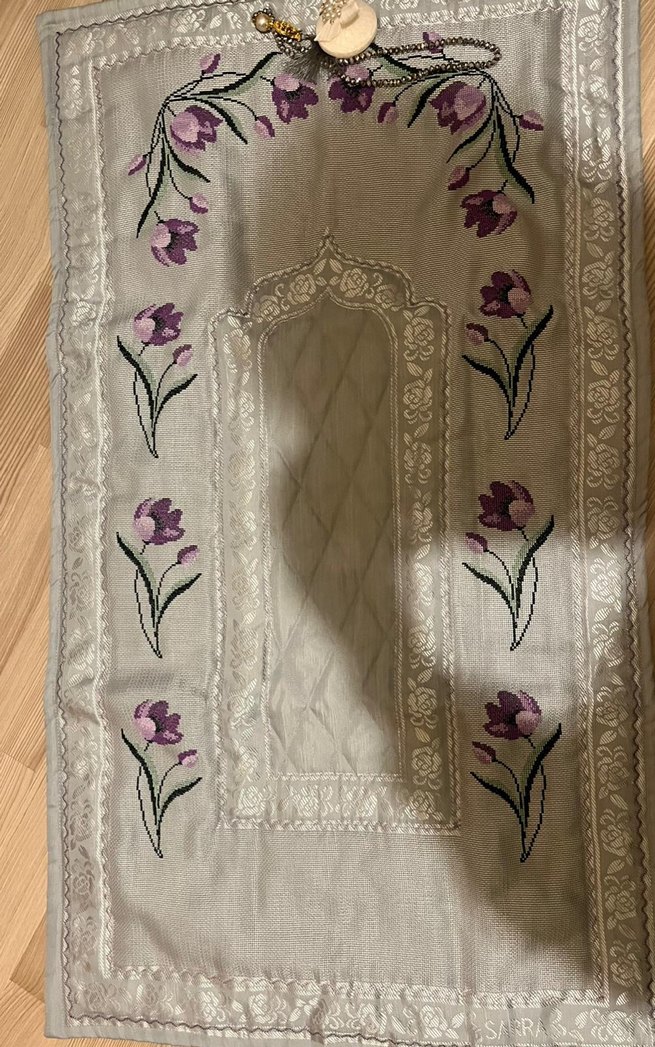 Gri zemin üzerinde mor çiçekler ve beyaz desenlerle işlenmiş geleneksel seccade.Yorganlamasız teslim edilecektir