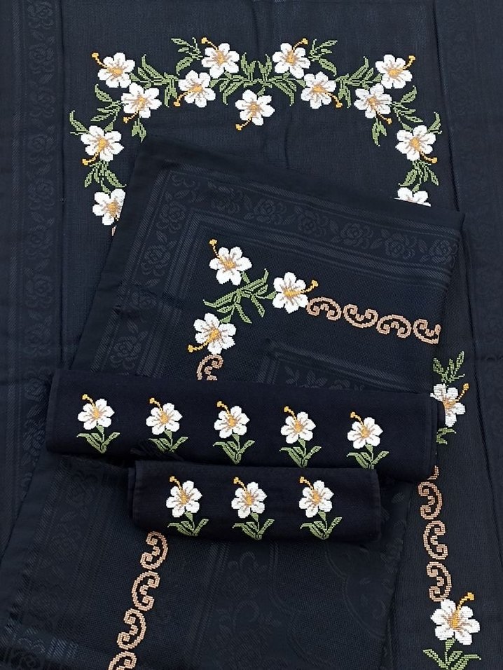Siyah zemin üzerinde beyaz çiçekler ve yeşil yapraklarla işlenmiş geleneksel desenler bulunan seccade seti. İstenilen modelde yapabilirim