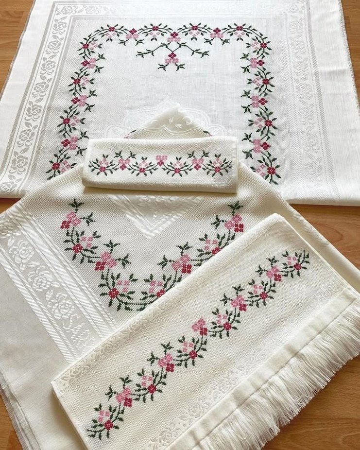 Pembe ve yeşil renklerde zarif işlemeli çiçek desenlerine sahip beyaz masa örtüsü ve uyumlu tekstil seti. Geleneksel tarzda, şık bir görünüm sağlar.