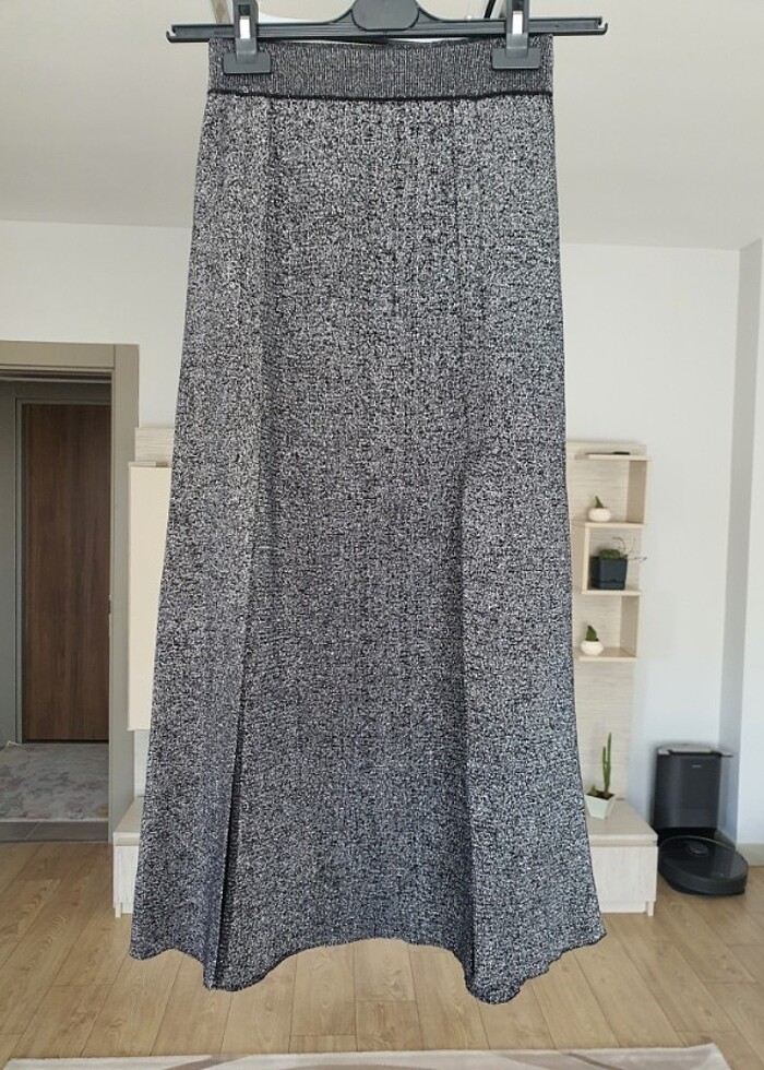 Simli diz altı kalem etek 40 bedene kadar uyumlu, önden 2 yırtmaçlı triko tasarım etek