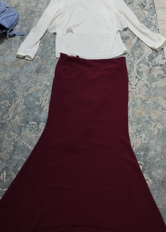 Az kullanılmıştır. Temizdir. Kalem etek önü kısa arkaya doğru uzuyor. Bluz iç gösterir. Etek mürdüm rengidir.