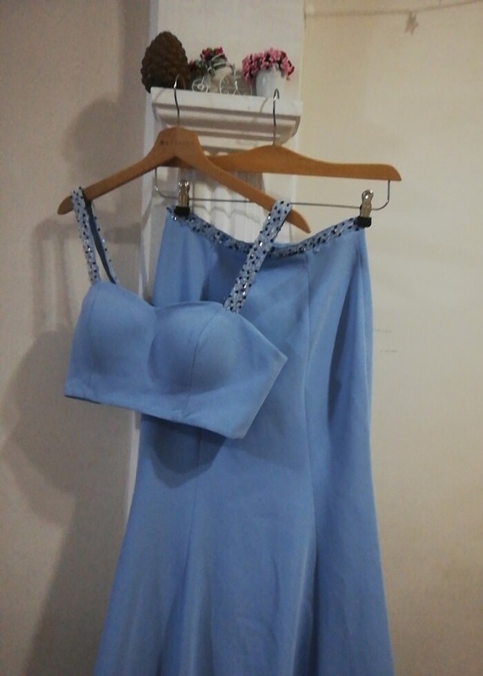 İkili takım. Etek boyu önden 120 cm arkadan 130 cm. Üst 30 cm. Kısa üst. Alana hayırlı olsun inşallah. Etek Beli 35 cm. Üst iki kol arası 42 cm. Bebe mavisi