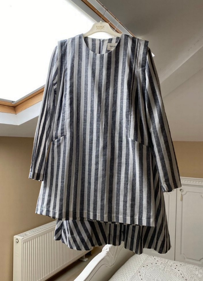 İnternetten alınmış fakat bedeni büyük geldiği için hiç giyilmemiştir. Son görsellerde manken üzerinde gözüküyor fakat omuz kısımlarının görüntüsünü değiştirmek için içe dikip biraz küçülttük yine de büyük oldu. İsteyen açabilir. Kumaşı pamuklu keten bir kumaş. 38-40 bedene uyumlu olması lazım, çünkü 36bedene büyük geldi. Gömlek boy ölçüsü 78cm, kol ölçüsü 62cm, iki kol altı ölçüsü 51cm. Gömlek arkadan fermuarlıdır, fermuar açıklığı 22 cm. Etek bel ölçüsü 33 cm, boy ölçüsü 91 cm. Eteğin beli lastikli içi astarlıdır, cepleri vardır, kloş bir model