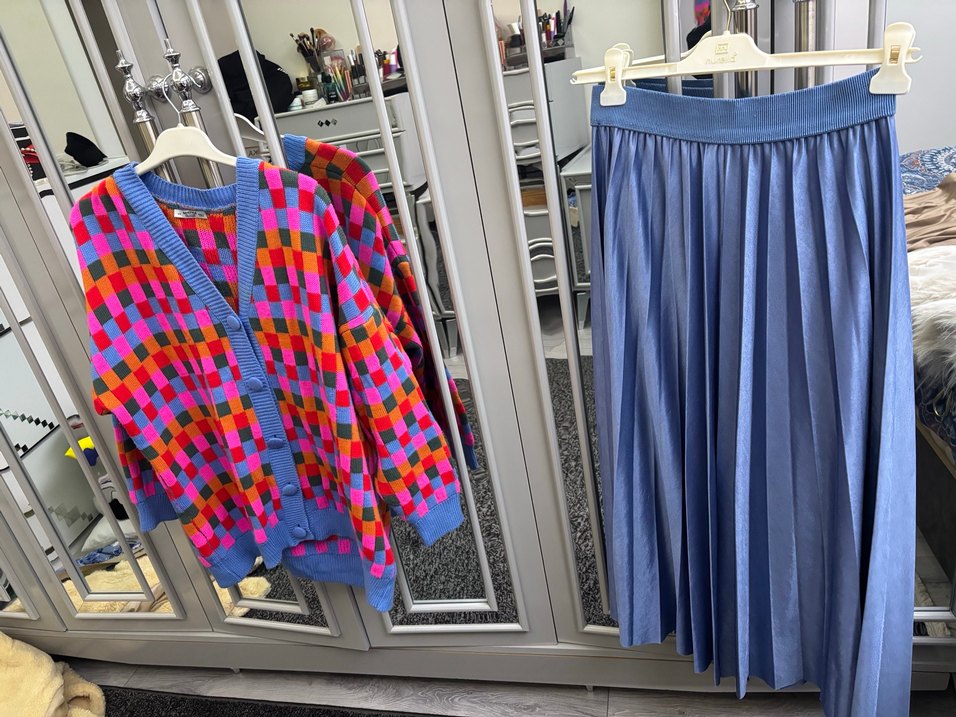 Renkli, pileli ve uzun tekstil etek, rahat kesimi ve çağdaş tarzıyla günlük kullanıma uygundur. Hırkayla gönderilecek