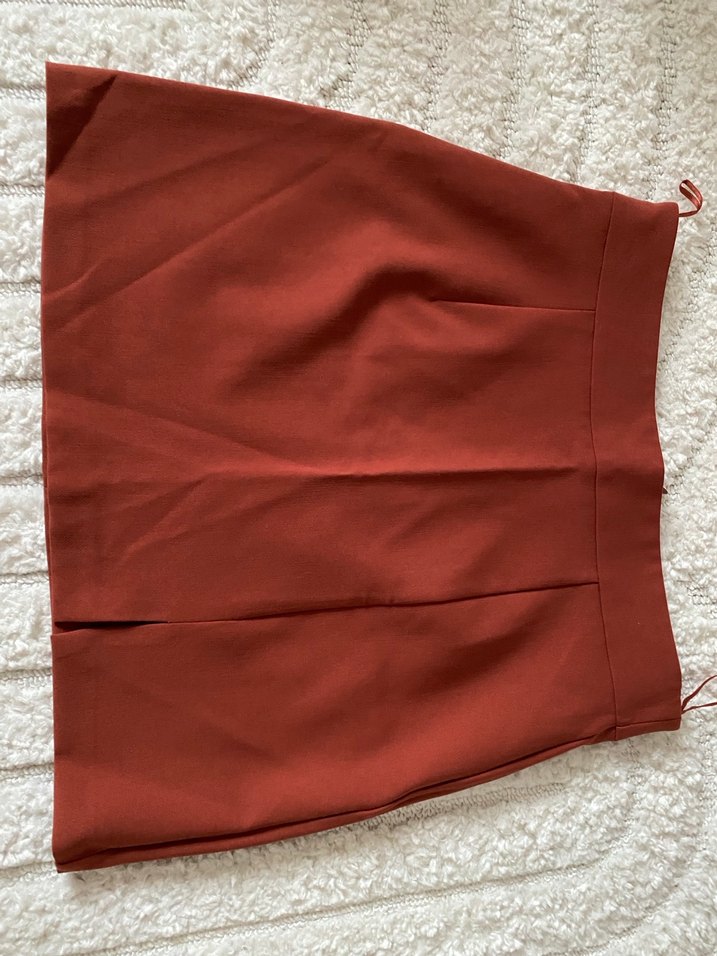 Küçük yırtmaç detaylı etek. İnce bir kumaş değil. Kiremit rengi.