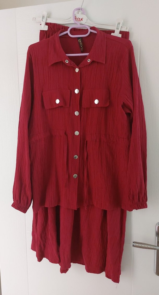 Bordo renkte, uzun kollu, düğmeli etek gomlek ikili takım gömleğin göğüs ölçüsü 50 cm dır. bi kaç kez giydim sıkıldım satıyorum