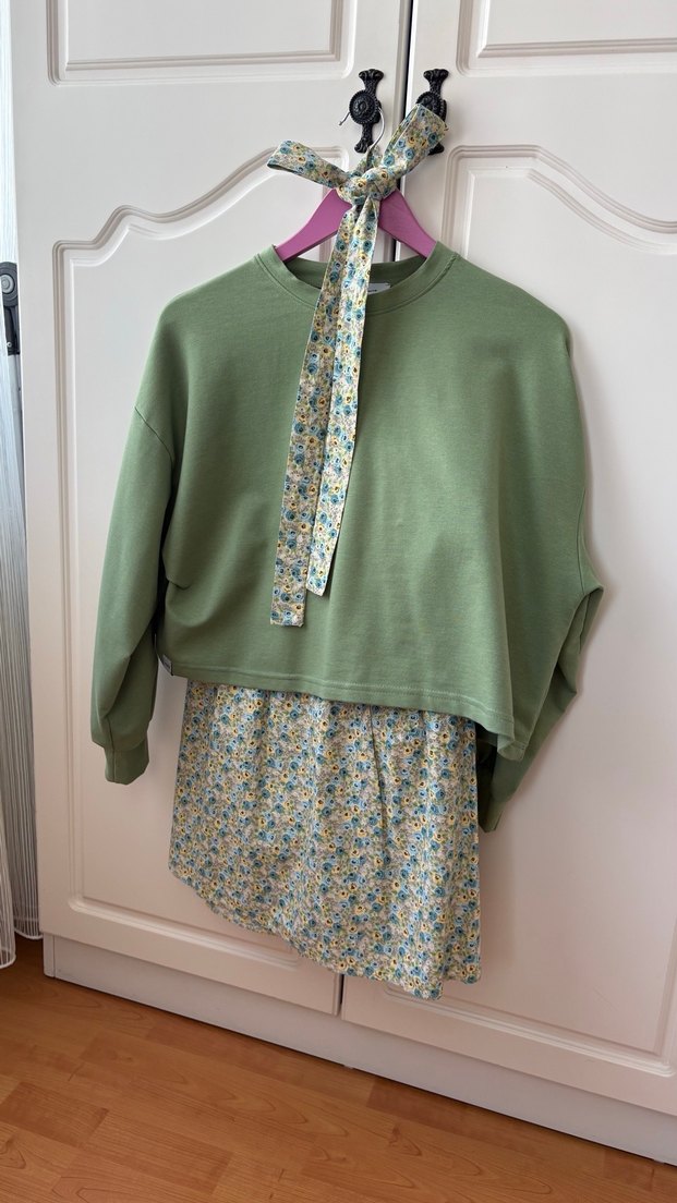 Yeşil kısa üst takımlı uzun etek Ceylan otantik markasına ait eteğin bedeni üzerinde yazmaktadır 40-42 beden üst ise oversize bol kalıp