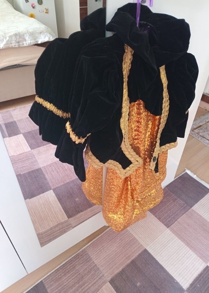 Arnavutlarin vazgeçilmez miltan yeleği ve altına da pul payetli balık model uzun sarı egeti. Siyah ve gold severler için harika bir üründür. Hiç giyilmedi. 2 parçadır. Yelek ve etek. 44 bedene kadar uyumludur.