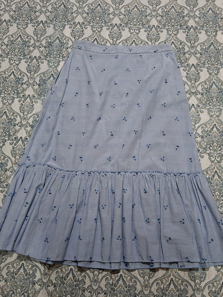 Adl marka etek çook güzel ama bana kısa oluyor, küçük mavi işlemeli çiçekler var üzerinde hiçbir sorunu yok