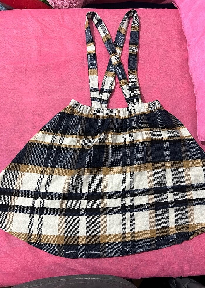 Etekli salopettir. Etiketlidir. İkinci resimde belirttiğim gibi hafif sökülme vardır. Ben aldığımda da öyleydi sonradan fark etmiştim. Onun dışında bir sorunu yoktur. Ölçüleri:bel 33 cm etek boyu ;42cm. Beli lastiklidir.