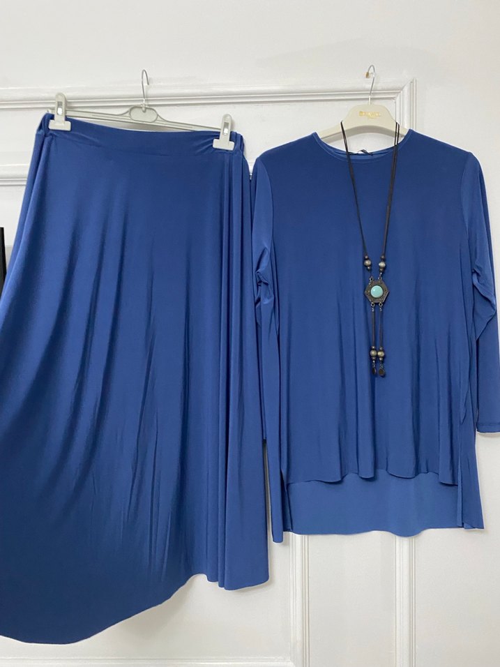 Kadınlar için uzun kollu, salaş kesim mavi tunik takımı. İpek gibi yumuşak kumaştan, drapeli ve yuvarlak yakalı, günlük kullanıma uygun.