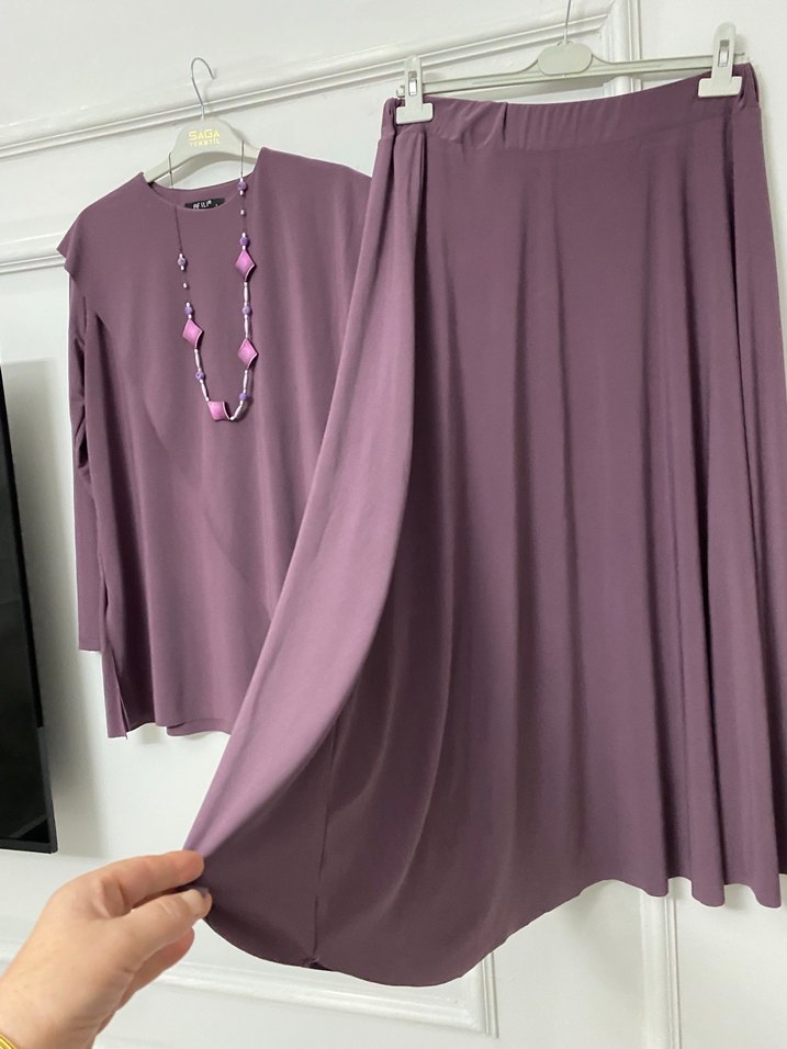 Mor renkli, uzun kollu, salaş kesim ve drapeli tasarıma sahip, yuvarlak yaka tunik. Yumuşak ve parlak kumaştan üretilmiştir, minimalist ve çağdaş tarzda.
