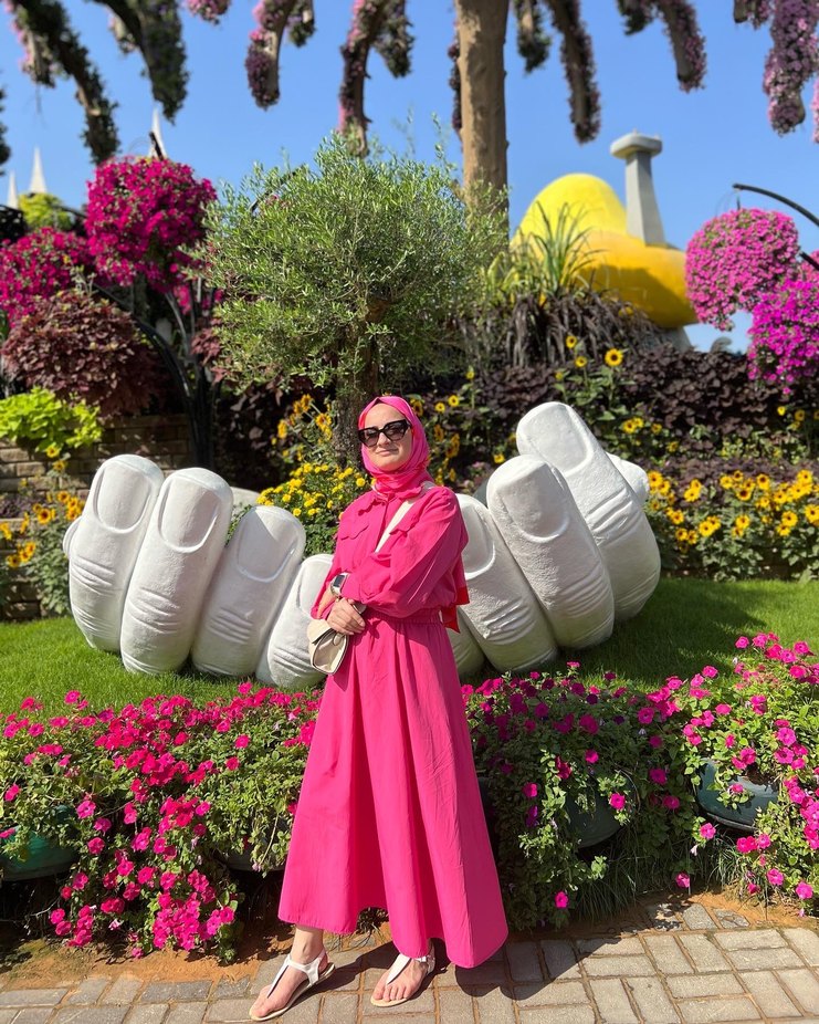 Pembe renkte, bol kesim ve drapeli detaylara sahip uzun elbise. Uzun kollu, yüksek yakalı ve hafif batik desenlidir. Günlük kullanıma uygun sentetik kumaştan, bohem tarzda.