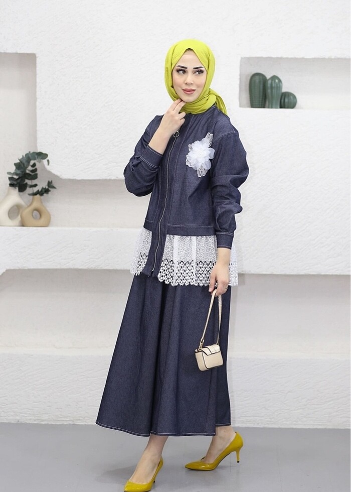 Güpürlü detaylı kot etekli takım rahat kalıp sıfır ürün