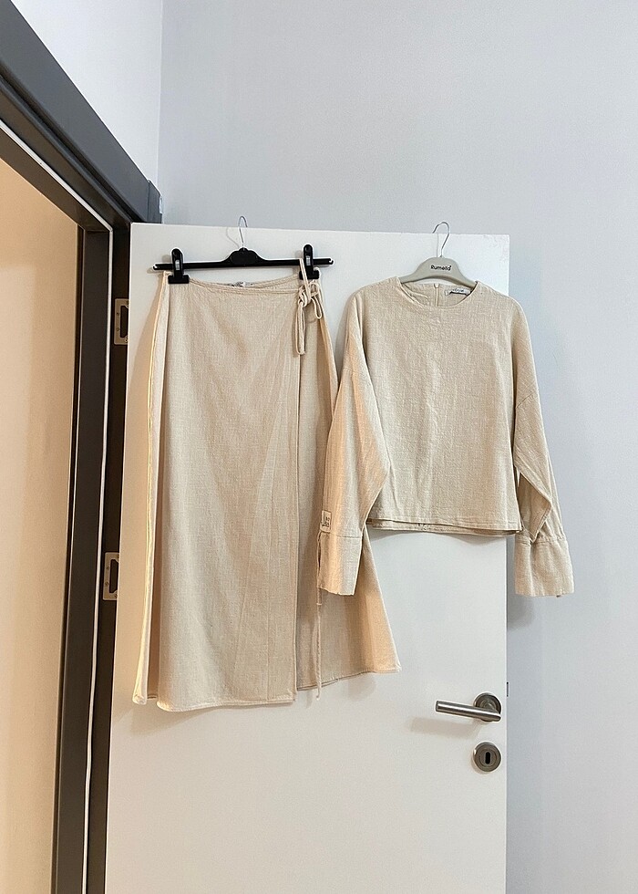 Sadece bir kez giyildi. Keten takım. Kumaşı harika 36/38 uyumludur. İçine uygun çamaşır giymeniz lazım.