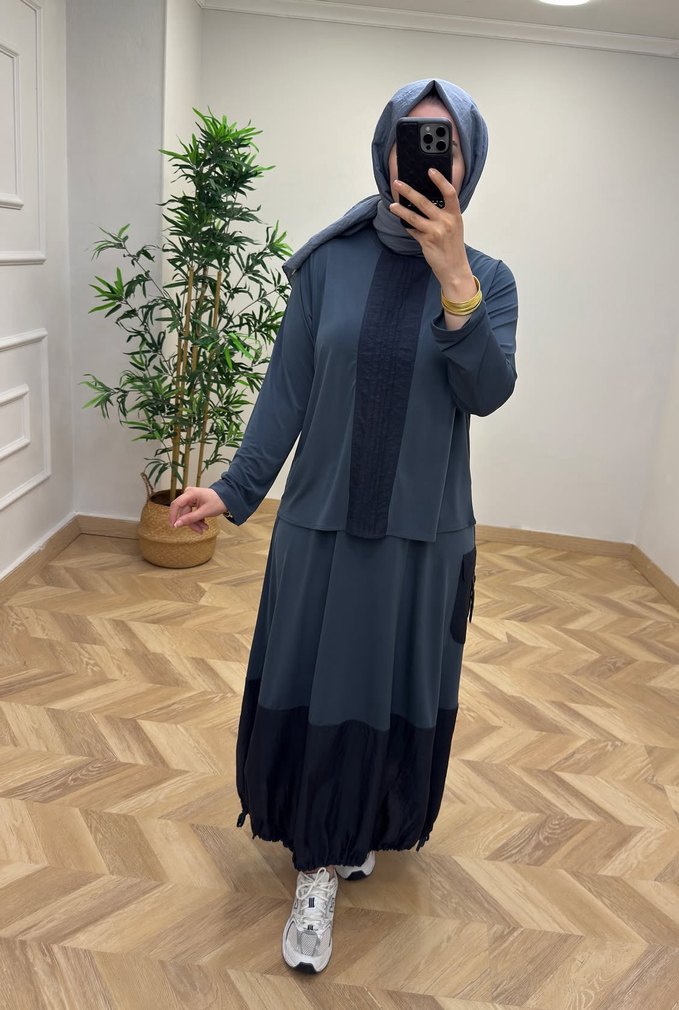 Gri renkte, uzun kollu, rahat kesimli, dökümlü tasarıma sahip sandy kumaştan günlük bohem etekli takım