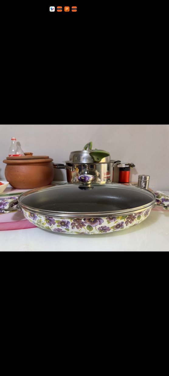 Dış kısmı mor çiçek desenli ve gri renkte, cam kapaklı tava. Kapak düğmesi de mor renkteki eternity kayık tencere bu sistemden aldım bu markayı 14 senedir kullanıyorum ve çok memnunum ama benim düşündüğümden de büyük geldi bu sebeple satışta 38*26 derinlik 8 cm alacaklar buna dikkat ederek alsın benim düştüğüm hataya girmeyin lütfen çok sağlam ve kaliteli bir marka ben 14 senedir kullanıyorum hala kullanmayada devam ediyorum