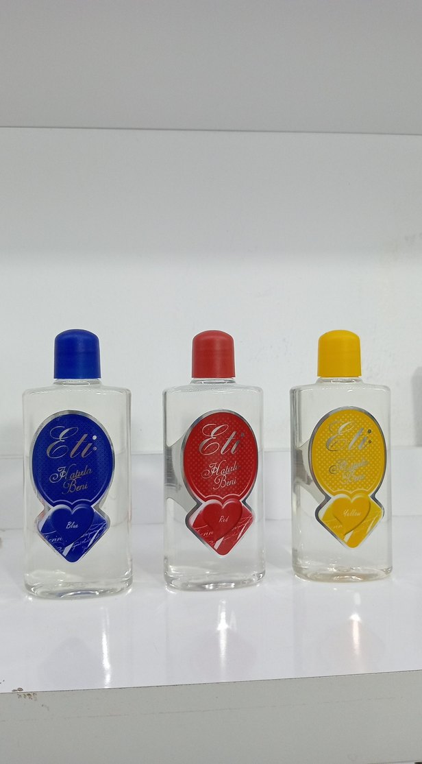Eti markasına ait, mavi, kırmızı ve sarı kapaklı, farklı kokularda üç kadın parfümü seti. Kokular arasında çeşitlilik sunar.