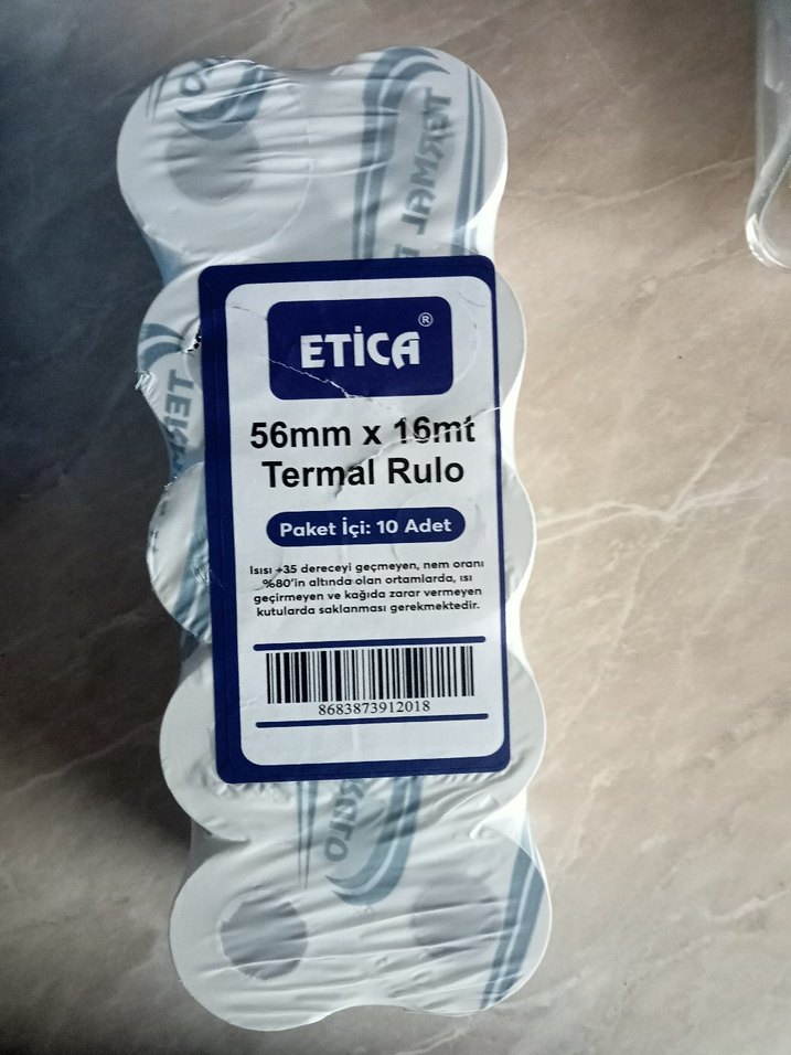 ETiCA markalı, 56mm x 16mt ölçülerinde 10 adet beyaz termal rulo paketi. Nem ve ısıya karşı dayanıklı, yazıcılar için uygundur. ️