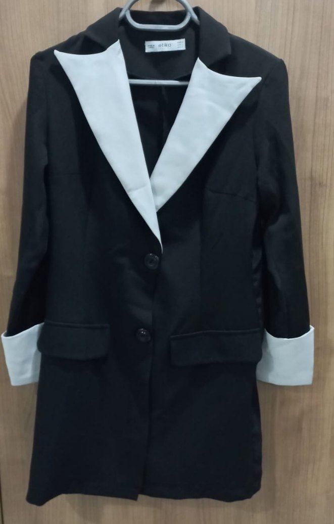 Siyah ve yakası beyaz, polyester, düğmeli ceket elbise. S beden yazıyor ama L bedene olur.